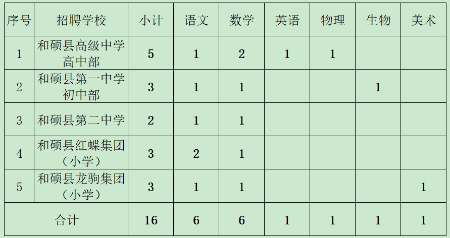 2024年,和硕县拟招聘各科师范类毕业生16名,任教我县中小学。具体招聘岗位情况如下: